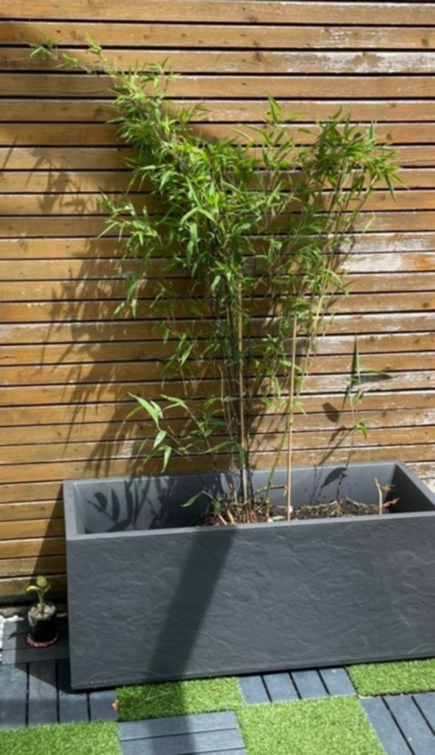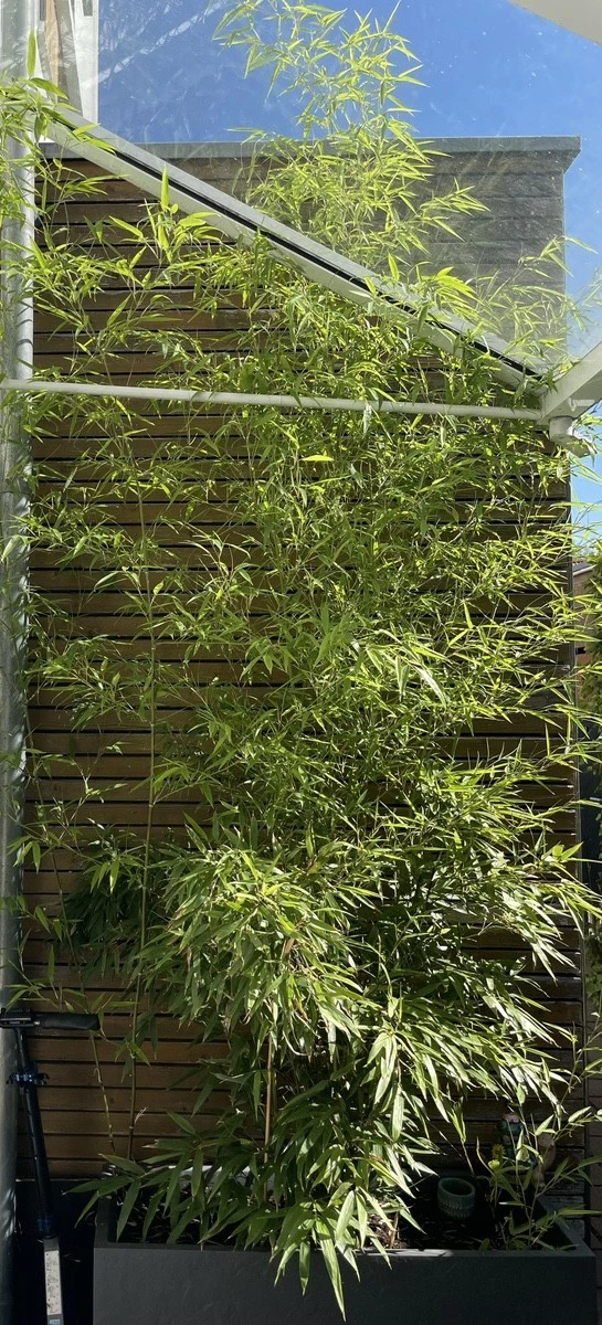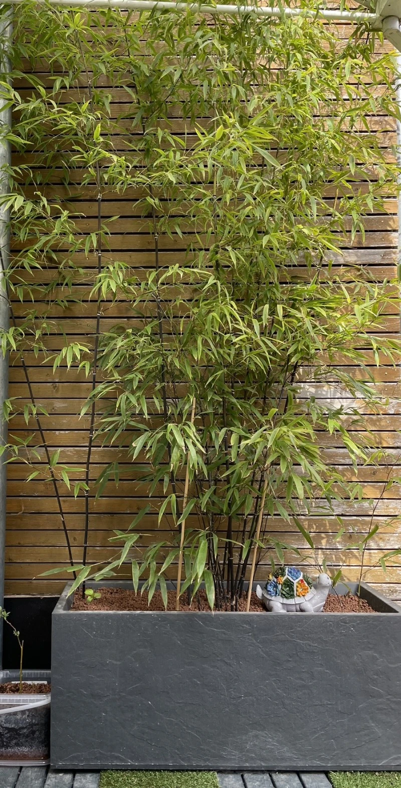 무서운 속도로 수세를 늘린 대나무! 뒤쪽 나무 벽면의 지저분한 부분이 대나무로 다 가려지고, 대나무의 높이가 2미터 이상으로 자라주어서 멋진 인테리어 작품이 되었다.