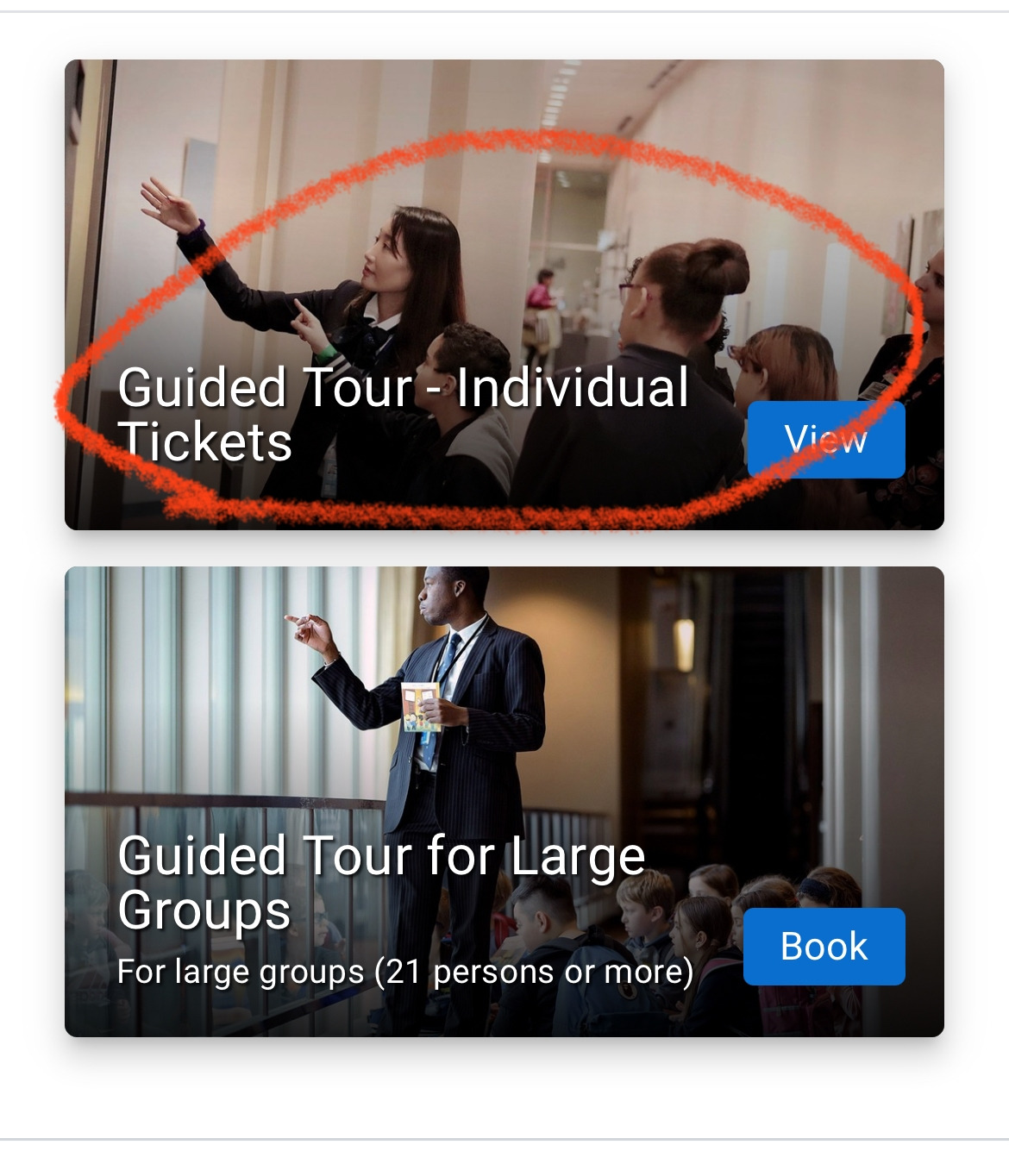 Book Now 클릭 - In Person Tours - Guided Tour: Individual Tickets - Guided Tour : English - 원하는 날짜와 시간 선택 - 비용 지불 후 예약 확인 이메일 수령