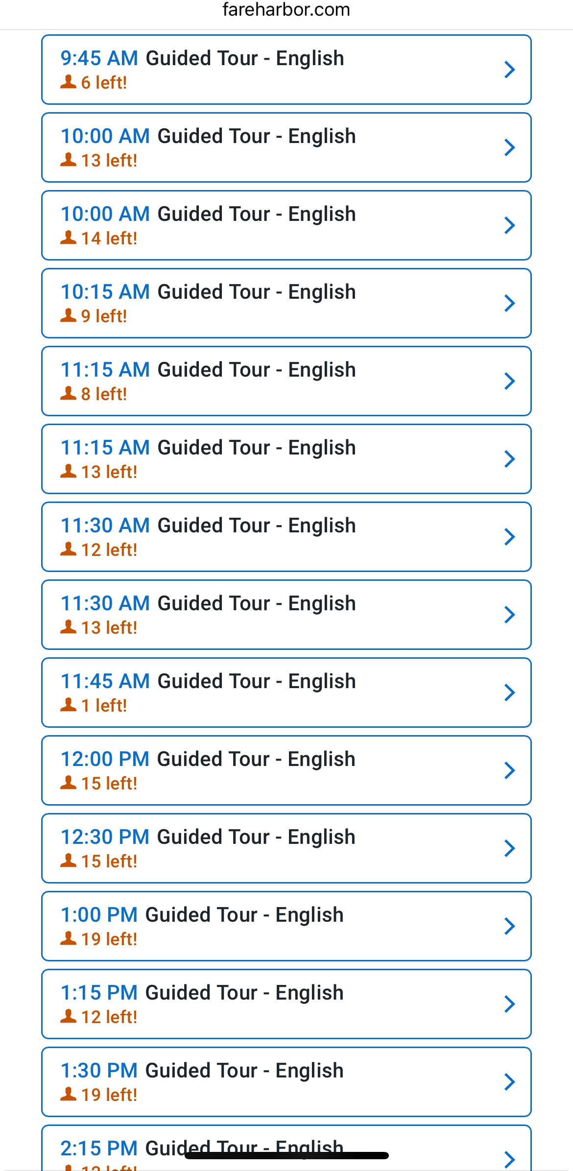 주중: 첫 번째 투어는 9:30에, 마지막 투어는 4:45에 시작.