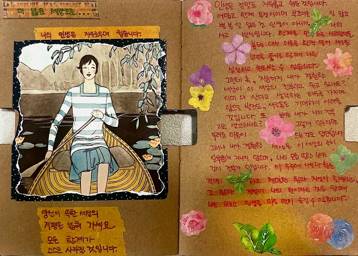 타국 생활은 생각만큼 만만치 않았다. 나라는 존재가 보이지 않았다. 내 이름 석 자를 찾아볼 수 없었다. 그때 나는 사춘기를 겪는 소녀처럼 정체성에 혼란을 겪었다. 남의 나라에 오니 언어가 다른 건 물론이고 그 어디에도 나 자신이 없다는 것이 나를 무척이나 힘겹게 했다. 다이어리는 그간 줄곧 쓰고 있었지만 내 마음을 토로하기 위한 창구가 필요했다. 그래서 일기장을 새로 만들어 그곳에 온 마음을 글로 표현했다. 때로는 길고 긴 문장으로 주절주절 때로는 임팩트 있지만 짧고 간결하게. 그렇게 쏟아내고 나면 한결 마음이 편안해졌다. 어느 날은 한글 일기로 어느 페이지는 영문일기로 그림을 도 그리고 스티커들로 꾸며주기도 했다. 한 장 한 장 넘길 때마다 그동안 보낸 시간의 희로애락을 고스란히 느낄 수 있었다. 그 시간은 차츰 일상의 비타민이 되었고 하루를 마감하는 시간이 되었다. 표현하는 방법은 달랐지만 내 안의 것을 게워낸다는 것은 다를 바가 없었다.