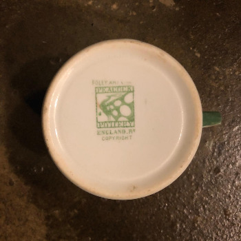 도표로만 보면 감이 잘 안 잡힙니다. 예시 몇 개를 들어볼까요. 선반에 있던 폴리 앤틱잔 하나를 집었습니다. 2000년대 중반 영국 옥션에서 낙찰받은 트리오입니다. 흔치않은 색감과 절제된 패턴 덕분에 오래도록 제 곁을 지키는 중입니다. 앞서 보여드린 백마크 히스토리에서 같은 모양을 찾아보니 1905년 무렵이라고 나옵니다.