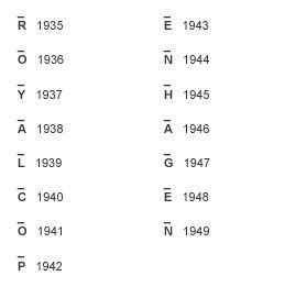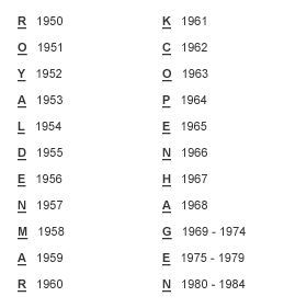 로얄코펜하겐은 표 1,2번을 보여드렸습니다. 뒷면 알파벳 중 선이 그어진 글자를 찾아보세요. 사진 속에서는 H 아래의 선을 볼 수 있습니다. 1967년생입니다. 알파벳 상단, 하단 중 어느 부분에 선이 있느냐에 따라서 봐야 할 표가 달라집니다. 집에 있는 코펜하겐 그릇을 꺼내 연습해보세요.