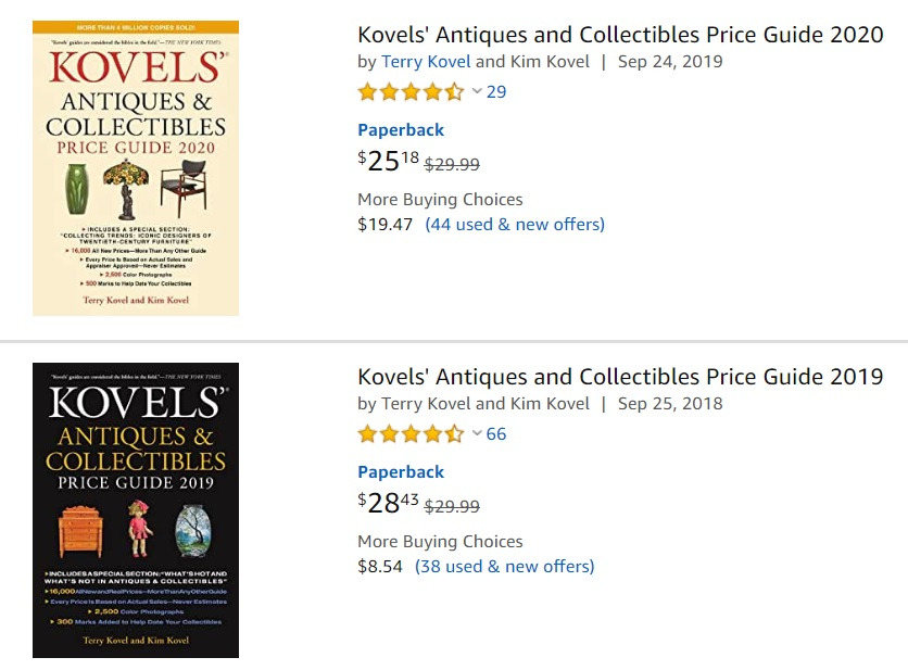 골동품 감별 분야에서는 최고로 손꼽히는 코벨스 부부의 사이트입니다. 해마다 수집할 만한 골동품 리스트, 품목별 가치 급락 평가를 모은 '코벨스'는 감정업계에서 필독서로 손꼽히는 참고서 같은 책입니다. 아마존에서 'kovels'로 검색하면 2020, 2019, 2018... 년도별 코벨스 콜렉터블 가이드 도서가 나옵니다. 한권만 집어서 후루룩 훑어보셔도 가치가 급증하는 아이템이 어떤 것들인지, 대강의 감이 잡힙니다. 가급적 최신년도의 책을 골라 보시는 것이 좋습니다. 가치에도 트렌드가 반영되니까요.