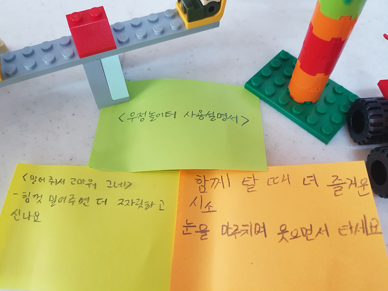 수업의 마지막 활동인 ‘놀이터 사용설명서’를 썼다. 붙임 종이에 간단히 쓰면서 우리가 함께 나눌 때 행복하다는 것을 느끼길 바랐다.