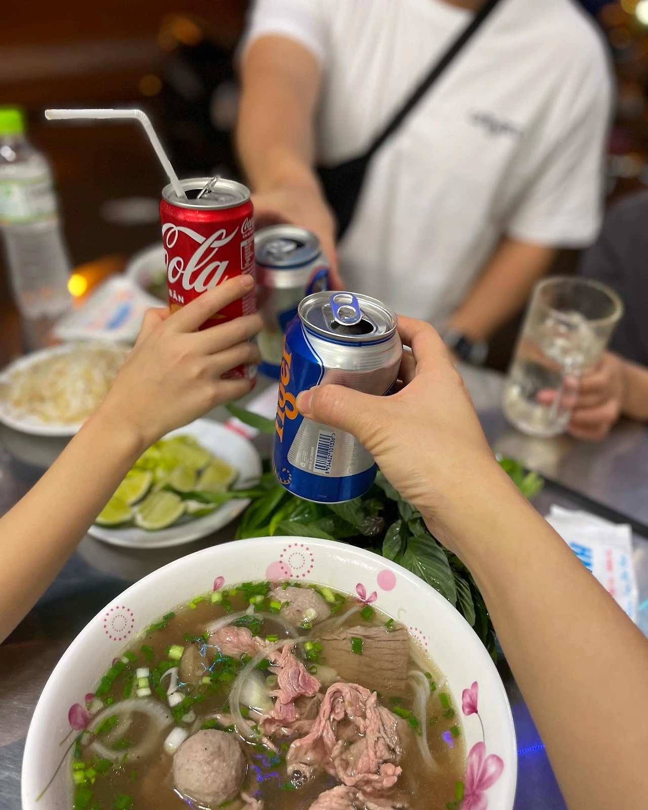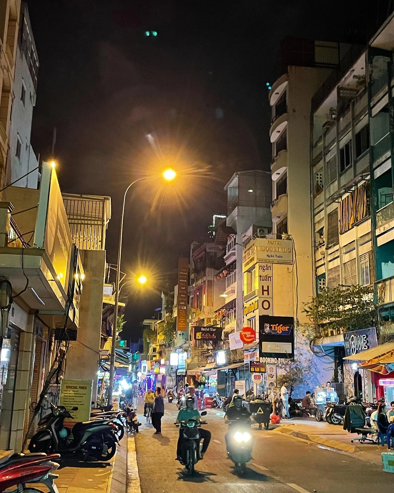 쌀국숫집 옆으로 화려한 술집골목, 윙윙거리며 지나다니는 오토바이들, 길거리 음식들. 그리고 쌀국숫집의 작은 플라스틱의자와 돈 주고 사는 물티슈, 쌀국수와 같이 나오는 여러 향신채. 가득 쌓아진 라임. 물값과 똑같은 맥주.