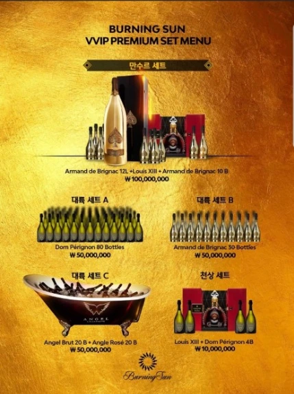아르망 디 브리냑 골드 샴페인과 루이 13세, 일반 아르망 디 샴페인 10병으로 구성돼 있다. 아마도 승리는 버닝썬을 오픈할 때 우리나라에서 가장 비싼 이 샴페인 세트에 어떤 이름을 붙여야 하나 많은 고민을 했을 것이다.