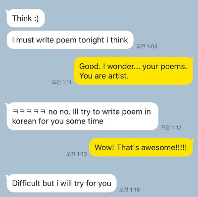 시를 받지 못했다면 나는 내 안의 다른 자아와 싸우기만 하다가 두 손 두 발 들고 도망가 버렸을 것이다. 현실에서 그를 선택하지 못했을게 뻔한데 영단어 몇십 개로부터 우리의 운명은 시작되었다. 이 시로부터......