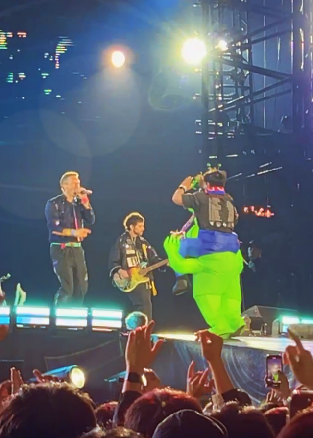 크리스가 무대 뒤에서 누군가를 부르자, 그 외계인+공룡 복장의 청년이 무대로 뛰어나왔다. 그는 자신이 너무나 사랑하는 밴드와 함께 노래를 부르고, 덩실덩실 춤을 추고, 무대를 쿵쿵 달리고, 크리스와 어깨동무를 하고, 포옹하며 노래했다.