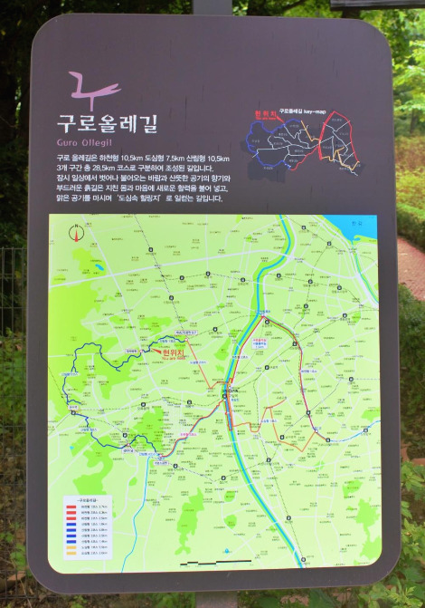 고척동으로 이사를 오고 한 달 지났을 무렵, 동네인근에 구로 올레길이 조성되어 있다는 정보를 접했다. 어느 날 목동행 버스를 타고 가다가 계남공원 입구에 서있는 푯말을 보고서 알았다. 그 다음 토요일, 인근식당에서 늦은 점심을 먹고 동네구경도 할 겸 이 골목 저 골목 거닐다 근처에 올레길이 있다는 사실이 떠올라 계남공원으로 발걸음을 옮겼다. 공원 입구에 도착하자 지난 번 버스에서 보았던 구로 올레길 산림형 1코스 안내판이 서있었다. 계남초등학교에서 시작해 오류중학교에서 끝나는 1.8km의 가벼운 산책코스다. 코스 시작과 끝은 학교에서 시작해 학교로 끝나지만, 코스 중간은 나무와 들꽃들이 올망졸망 모여 있는 야산에 조성된 계남공원의 능선길을 따라 걷는 길이다.