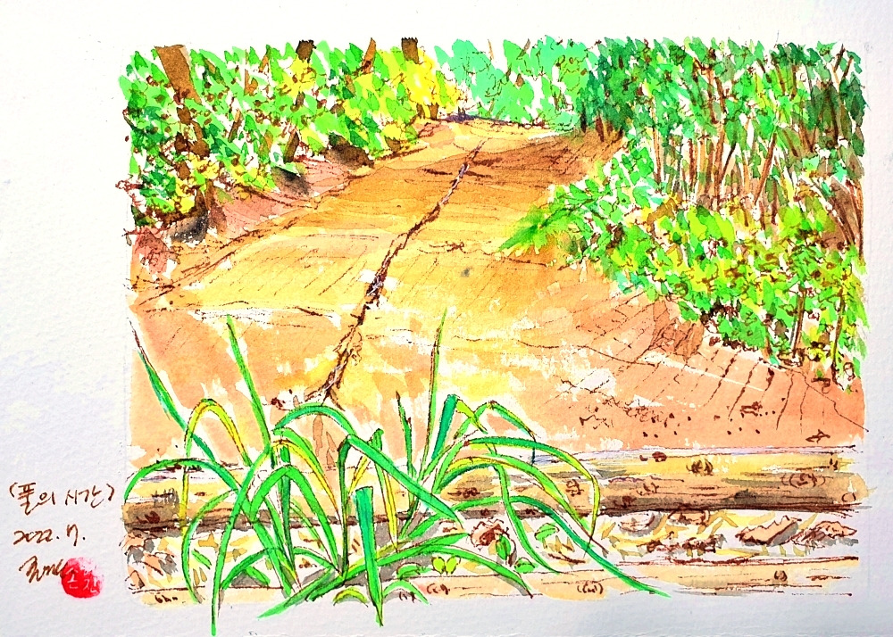 풀은, 어제오늘 본 것들을 씨앗에 새겨놓는다. 굳이 길 한가운데다 뿌리를 내리고 안테나처럼 사방으로 풀 자락을 뻗어놓고, 여기 세상의 주인은 자기들라고 오해하는 인간이란 종을 구경한다.