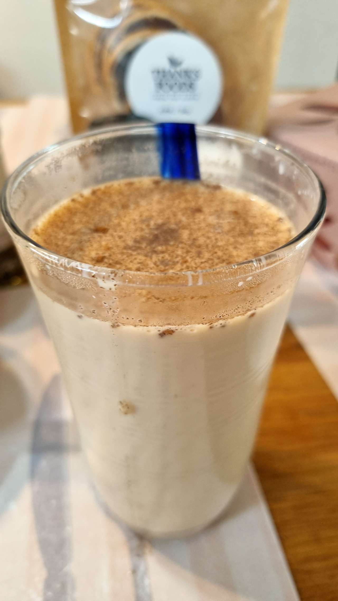 - 유리잔에 거품이 나도록 따라주고 시나몬 가루를 살짝 뿌린다.
