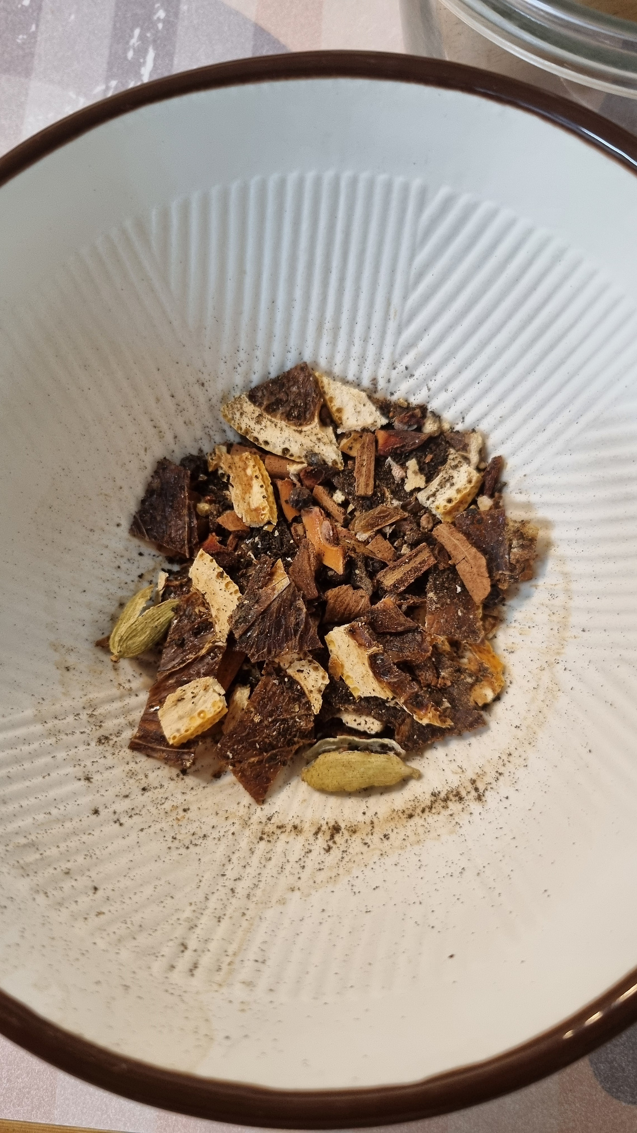 - 각종 향신료와 홍차 잎을 깨갈이에 넣고 작게 빻았다. 향신료의 양은 취향껏 이긴 하지만 정향이 이 모든 향신료의 갑이기 때문에, 적게 넣는 것을 추천한다