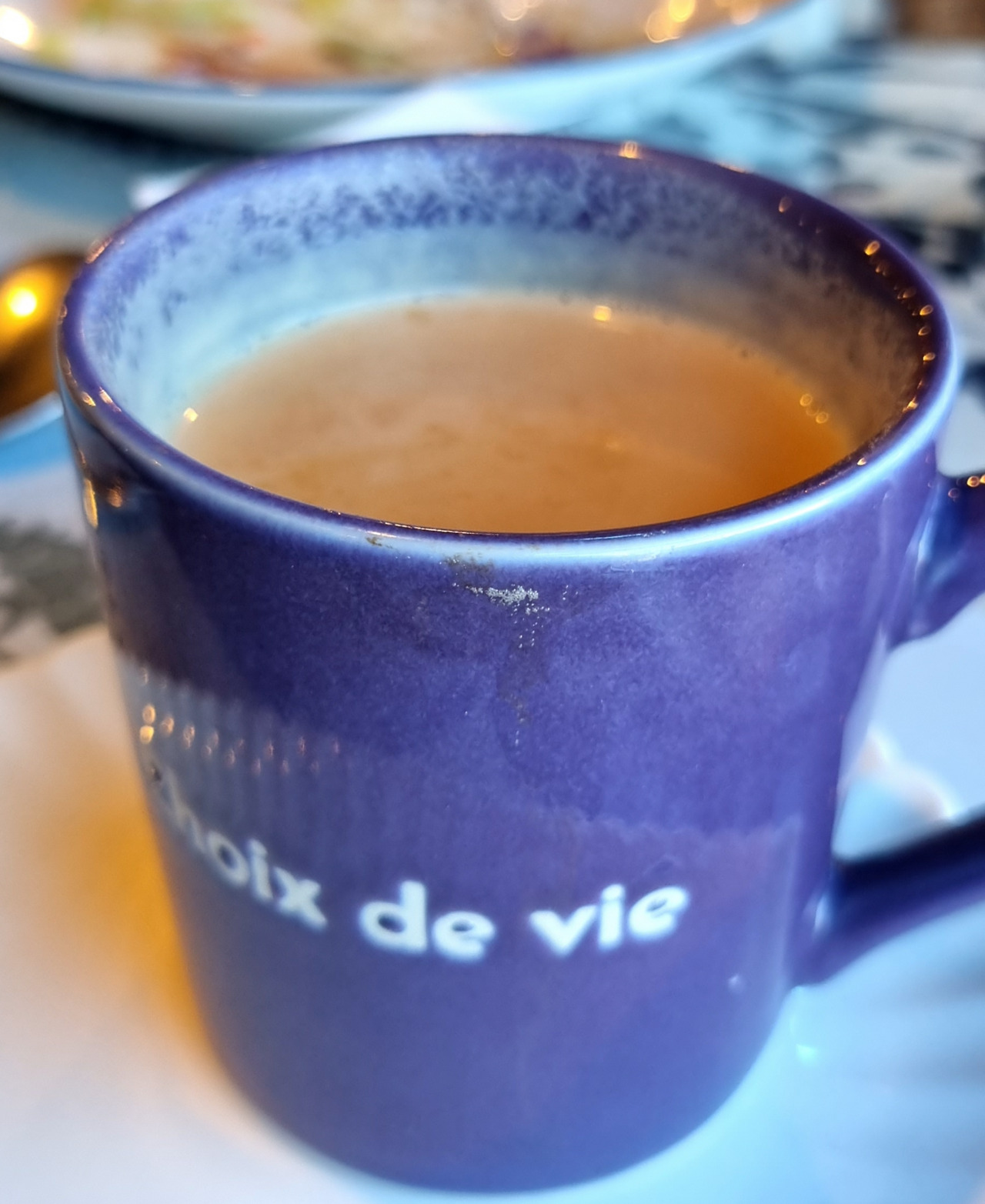 식후에 입가심으로 마살라 짜이를 한 잔 마셨는데, 처음 느낌은 뭔가 온천맛이 나는 밀크티 같았다. 향신료가 들어가긴 했지만 너무 강하지는 않았고 밀크티의 고소함과 달콤함이 입안에 남으면서 식후에 먹는 차로 나쁘지 않았다.