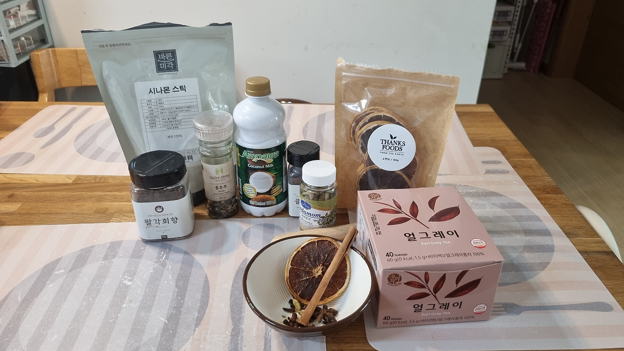 향신료 : 팔각, 시나몬(계피), 정향, 통후추, 생강분말, 말린 오렌지, 카다멈
