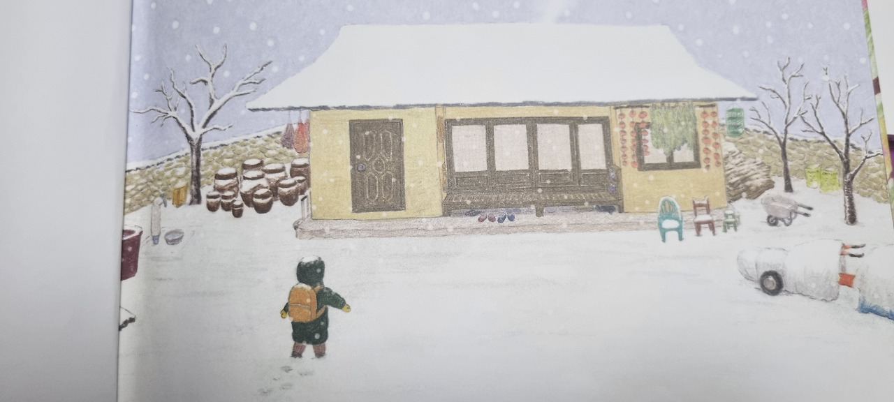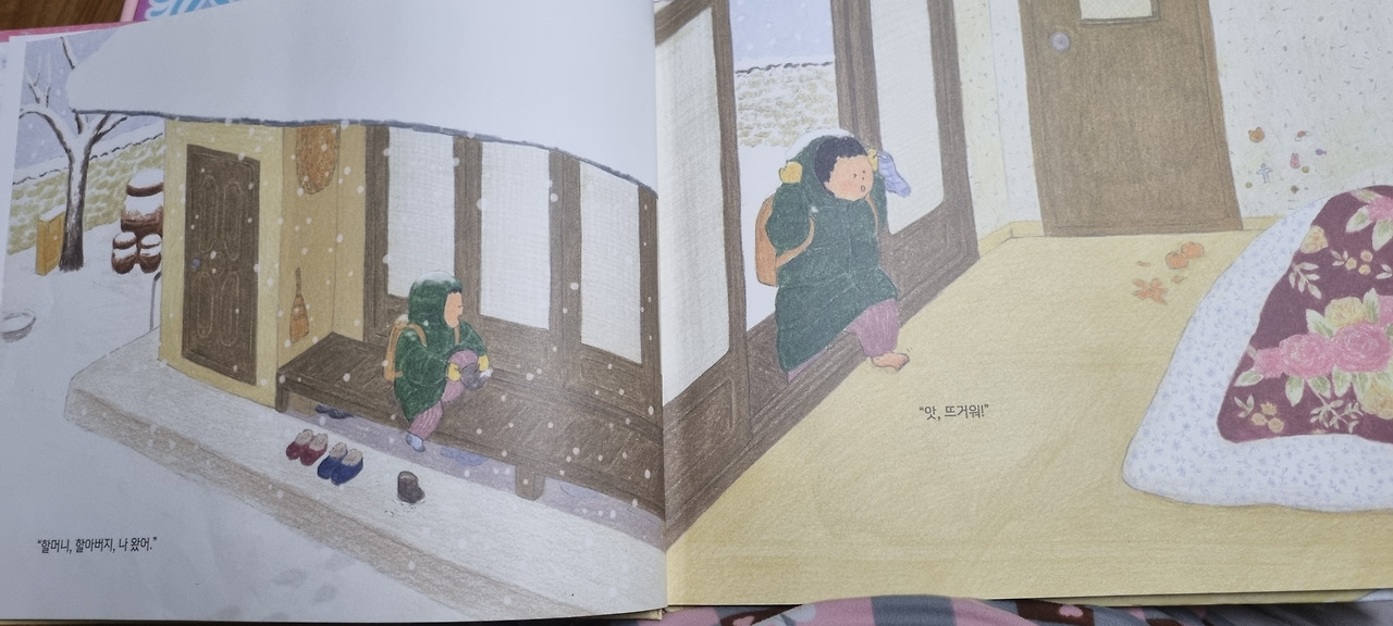 <겨울 이불>은 엄마아빠에게도 익숙한 겨울풍경으로 시작한다. 온돌방이 지글지글 끓던 할머니 할아버지 집 풍경으로부터 말이다. 학교 끝나고 할머니 집에 가보니 할머니는 안 보이고 꽃무늬 솜이불이 방바닥을 덮고 있다. 바깥의 꽁꽁 얼어버릴 것 같은 추위를 견디고 온 주인공은 겉옷과 잠바 양말을 휙휙 벗어던지고 내복만 입은 채 이불 안으로 기어들어간다.