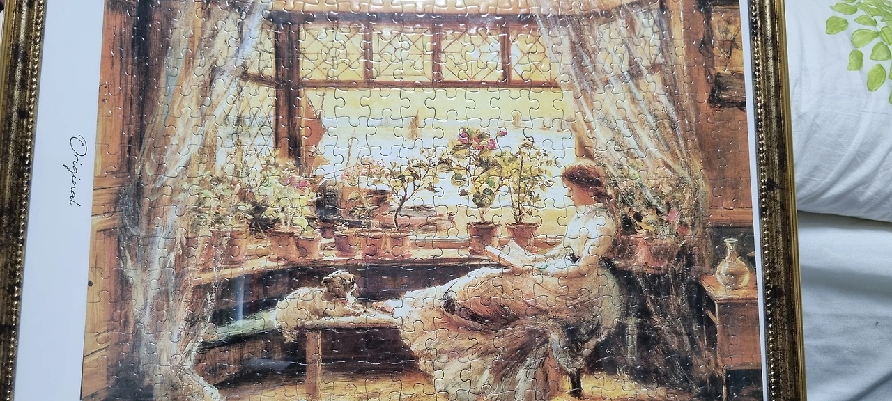 맨 처음으로 끝까지 맞춘 퍼즐. 예전에 선이 흐린 명화퍼즐은 도저히 못하겠다 했는데 어느날 밤에 홀린듯이 피스가 맞춰지는 경험을 한 뒤로 명화 퍼즐 고인물이 되었다하지만 이 취미는 성취의 목표에 홀려 한번에 끝내려 할수록 포기하기 쉬운 면이 있었다. 나는 그래서 몇 달을 두고 아주 적은 양이라도 꾸준히 하려고 애를 썼다. 최근에는 500피스를 5개월 만에 끝내기도 했다. 한동안은 아무리 안 풀릴 것 같던 작은 조각들도 그다음 날, 그다음 날 계속해서 몇 개씩 시도하면 의외로 풀리는 경우가 있었다. 1000피스를 맞추기 위한 관건은, 맨 처음에 틀을 잡을 것, 둘째는 한 번에 많은 양을 하지 말 것, 일정 시간이 되면
