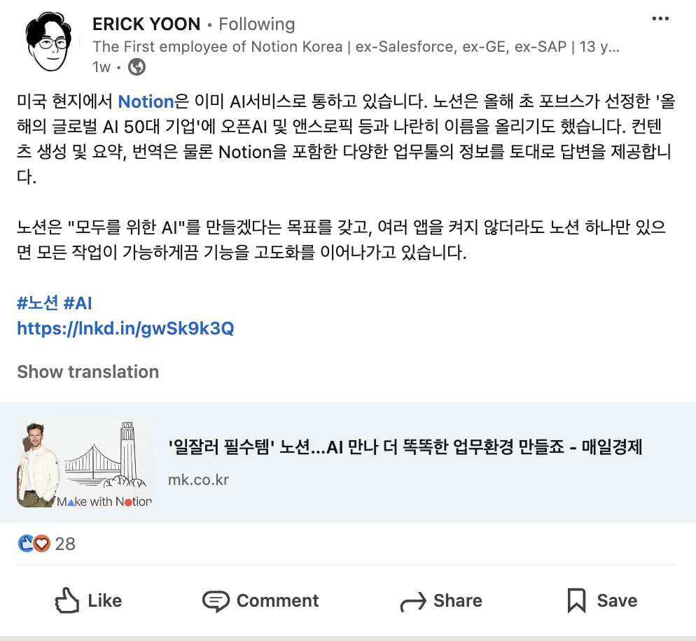 예를 들어, 한국에서도 점차 주목받고 있는 노션(Notion)이라는 회사의 사례를 들 수 있다. 노션의 한국 시장 Account Executive인 에릭 윤(Erick Yoon)이라는 분은 꾸준히 한국어로 노션 관련 포스팅을 올리고 있다. 물론 회사의 공식 포스팅은 영어로 이루어지지만, 이분은 한국 시장 담당자로서 링크드인에 회사 소식이나 업계 인사이트를 한국어로 공유한다.