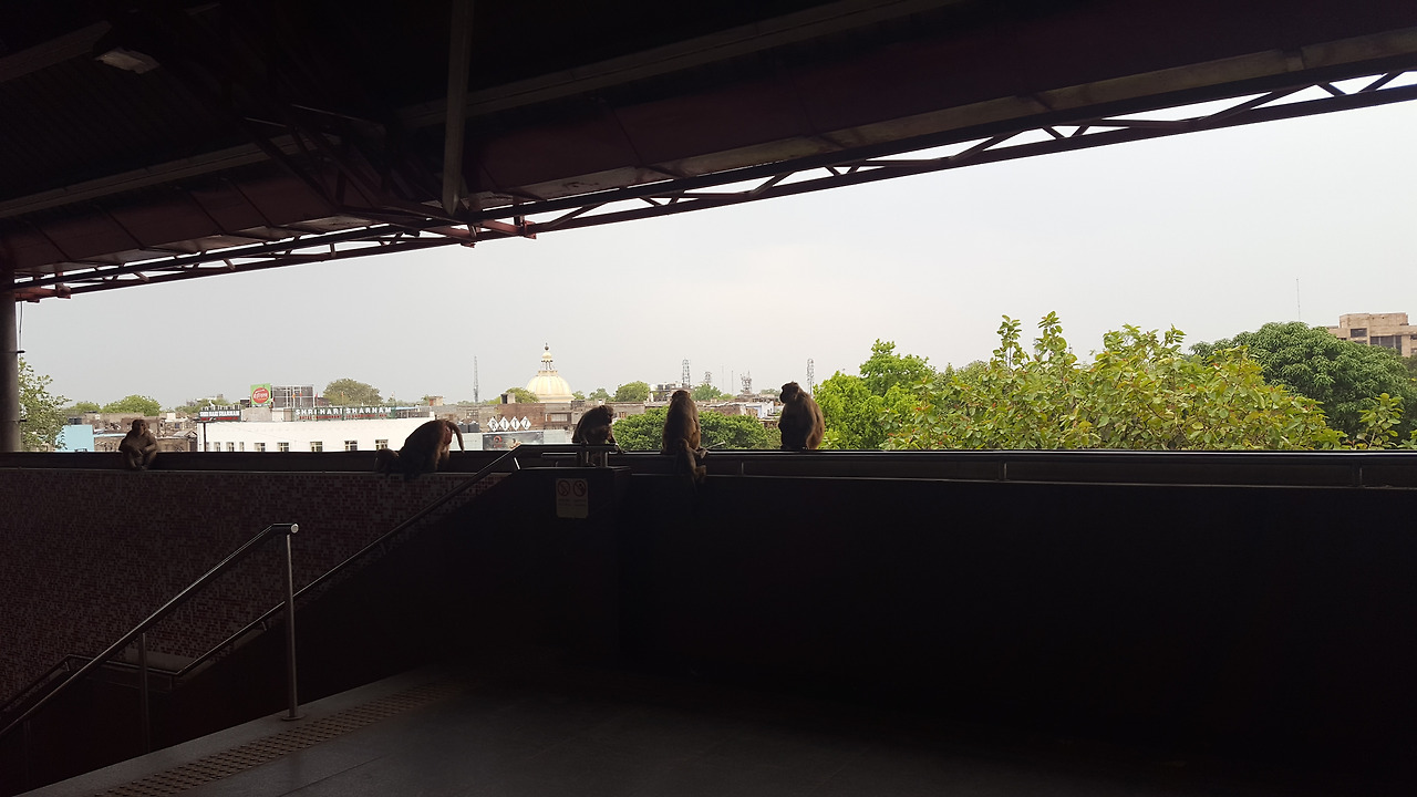 인도의 한 전철 플랫폼 안에 앉아 쉬고 있는 원숭이들