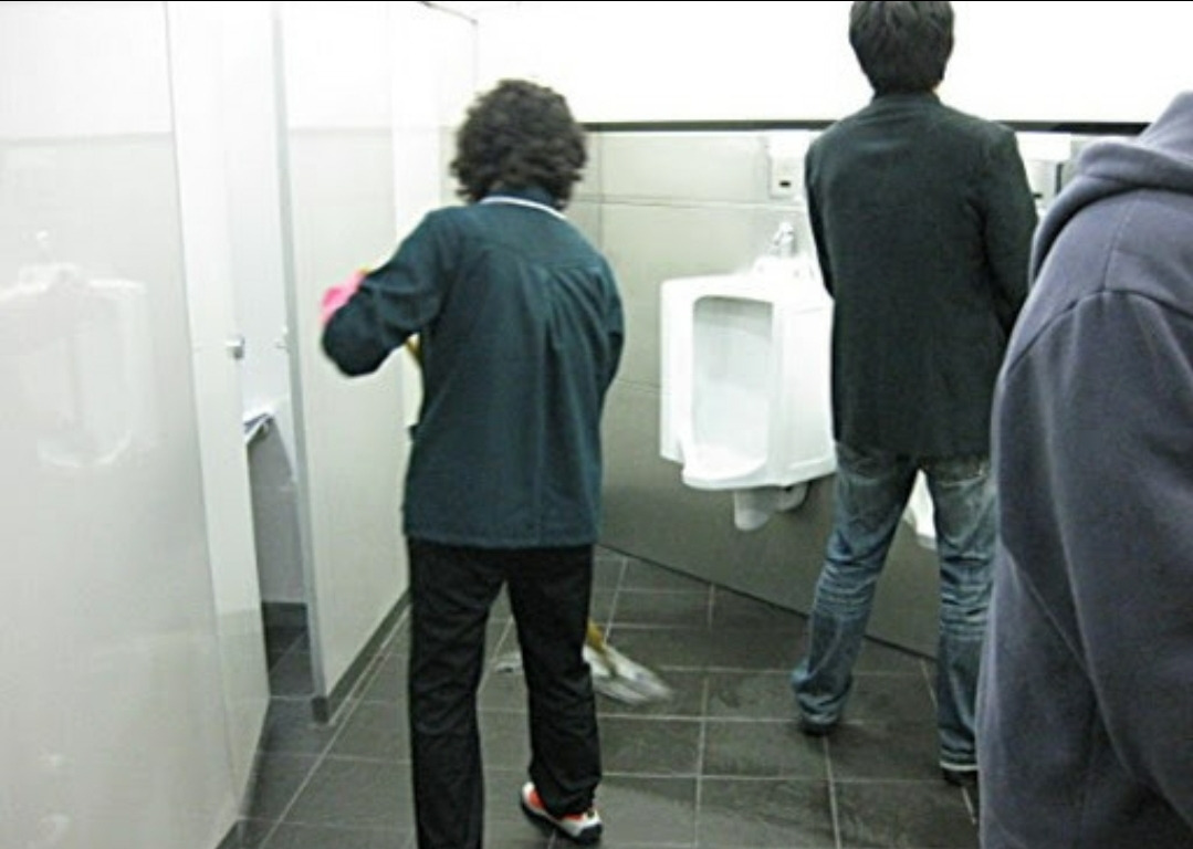 나이 먹으면 부끄러움이 없어진다고 했던가! 남자화장실에 남자들이 볼일을 보고 있으면 멈칫할 만 도한데 이 아줌마한테 그따위 매너를 바라는 건 차라리 우주선을 타고 달나라 여행을 가기를 바라는 것만큼이나 요원한 일일뿐이다. 심지어는 한창 방화수를 뿌리고 배설의 희열을 맛보며 집중하고 있을 때 발밑으로 느닷없이 대걸레가 불쑥 들어오기도 한다.