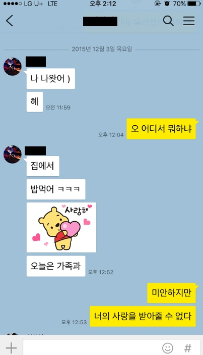 다음은 군입대 이후로 첫 휴가를 나온, 나와 가장 친한 남자 사람 친구(S군이라 부르겠다.)와 나눈 카카오톡 대화이다.