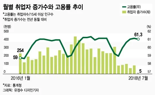 출처: <머니투데이>. 취업자수 증가 최저 vs 고용률은 최고 수준…헷갈리는 고용지표. 2018년 08월 22일