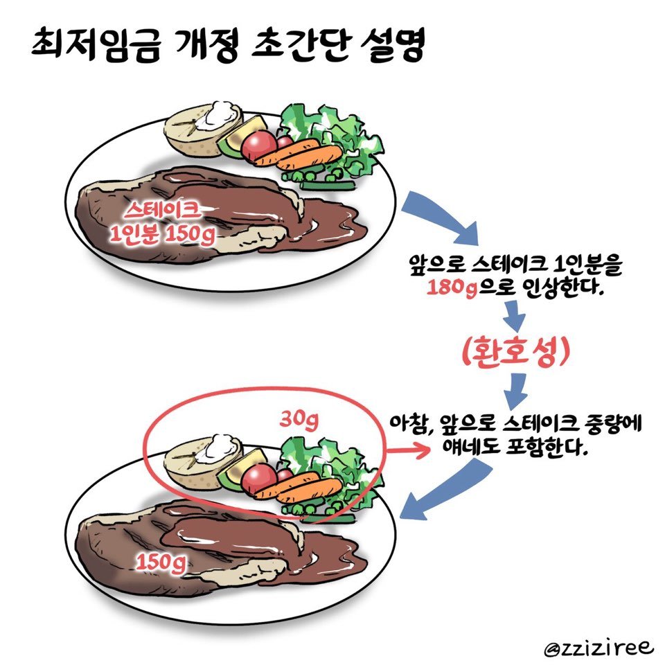 정기상여금 등을 최저임금에 포함시키게 되면, 최저임금이 자동으로 증가합니다. 따라서 문재인 대통령의 공약대로 2020년에 최저임금 1만원을 맞춘다고 해도, 지금보다 더 올릴 여지가 줄어듭니다. 즉, 산입범위 확대만큼의 임금인상이 없이는 결국 '실질임금'이 감소하는 결과가 나올 수 있다는 것입니다. 그러니 인상폭이 결정되지 않은 상황이라면 더더욱 그런 문제들이 엮이게 되어 있습니다. 양대노총이 반발하는 이유입니다. <딴지일보> 만평에 최저임금 개정안에 대한 노동계의 입장을 정말 잘 설명한 그림이 있어 이를 공유합니다.