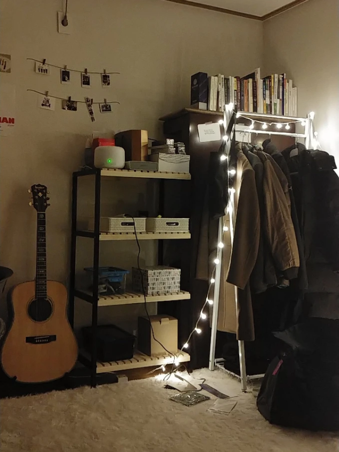 비싸고 세련된 방도 아니고, 이 방을 얻기 위해 절실한 사연이 담기지도 않았다. 다만 이 방에는 내가 묻어있는 물건들이 잔뜩 있다는 사실이 나를 안정시켜주고 있었다. 벽 이곳저곳에는 추억담긴 사진들도 붙이고 내가 좋아하는 일러스트 작가의 작품도 걸어두었다. 바닥에는 부드러운 러그를 깔았으며 침대엔 오랫동안 덮어 온 이불과 베개가 있고, 형광등을 꺼둔 채 내가 좋아하는 노란 전구로만 밝힌 채 지낸다. 그리고 선반에는 그동안 모아둔 사진이나 편지들이 들어있는 추억팔이 박스가 항상 내 시야에 있는 것이다. 마지막으로 암막커튼을 치고 무드등 가습기를 켠 채 블루투스 스피커까지 연결하면 잠들기 전까지의 시간들을 누릴 준비는 더할 나위도 없다.