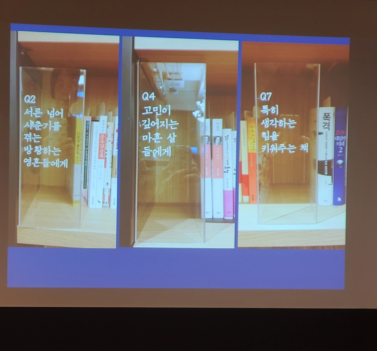 이어 최 대표는 "질문"이 곧 해법이고 목표라고 했다. 해법의 수준은 곧 '질문'에 비례한다고. 그리고 Why와 What 중에 '왜, Why'에 집중하며 나는 왜 이 일을 하는가?라는 질문을 가지고 지속적인 씨름을 해갔다고 했다. 그리고 책은 워낙에 좋아하고, 글은 평생 써왔으니, 어쩐지 책 관련 일은 재미있을 것 같고 잘할 수 있을 것 같았다고 했다. 그리고 창조적인 해결책, 솔루션으로서의 책의 기능에 주목하게 되었다. 추천서가의 방식을 채용하여 고민이 있고 해결책이 필요할 때 책이 하나의 솔루션으로 제안되고 그러한 제안을 만나는 체험을 하는 곳으로 책방을 선택했다. 그리고 최인아 서점으로 하지 않고 책방으로 한 것은 책을 파는 점포가 아닌 책과 시간과 경험, 체험을 함께 할 수 있는 노래방, 사랑방처럼 책방으로 이름을 지었다고 했다.