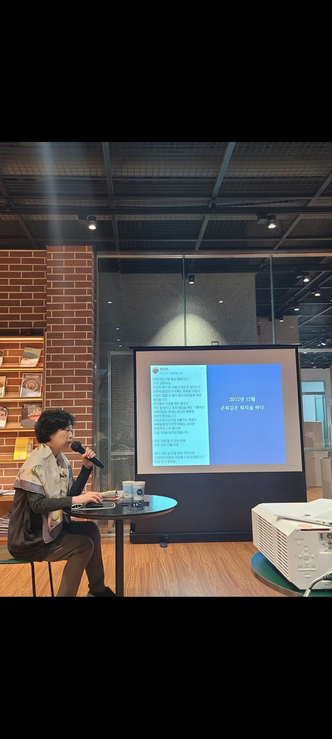 생각보다 근엄한 얼굴의 최인아 대표는 우선 2020년 1월 강남 파이낸스 센터에 오픈한 제2 최인아 책방의 사진을 보여주었다. 건물주가 최인아 씨를 찾아와 책방이 있으면 좋겠다고, 건물의 가치 면이나 상권 형성에 도움이 되니, 파격적인 임대조건으로 (아마도 거의 무료?) 입점을 했으나 관리비가 무척 비싸다고 하셨다. 어쨌든 52세에 전적으로 본인의 의지로 본인의 타임 테이블에 의해서 자발적인 퇴직을 하고 퇴직 이후에는 평생 학생으로 살아야겠다는 생각으로 은퇴생활을 시작했다고 했다. 그런 분이 어떻게 책방 마님으로 강남에서 자석처럼 사람들을 끌어당겨 지성, 문화, 예술, 소통, 힐링의 공간을 창조해나가고 있는지 너무나 궁금했다. 그리고 대표님은 조근조근 자세해 친절하게 그 이야기를 사진과 함께 들려주었다.