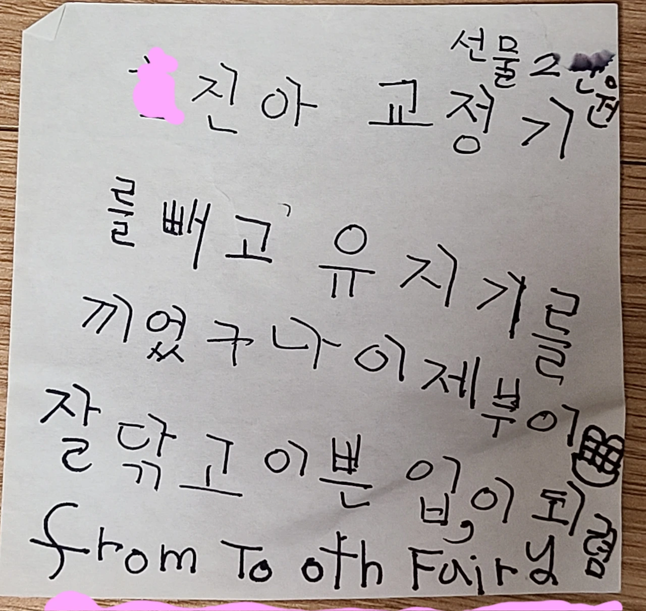 내가 어렸을 때는 치아가 빠지면 지붕에 던지고 '까치야 까치야 헌 이빨 가져가고 예쁜 새 이빨 다오' 했던 기억도 났지만 요즈음엔 던질 지붕이 딱히 없다. 그래서 두 아이 키우면서 유치는 모아 두었다. 요즈음은 Tooth box라는 것을 팔아서 치아 번호대로 보관도 한다는데 그렇게는 못하고 대신 아이 치아가 빠지면 모아 두고 그날 밤 베개 아래 약간의 용돈을 넣고 이빨 요정의 메모를 함께 넣어주곤 했다. 녀석 그런 기억이 났는지.. 어느 사이 이렇게 컸는지... 섬세하고 사랑이 많은 딸덕에 내 치아는 앞으로도 이빨요정이 잘 관리해 줄 것이 틀림없다.