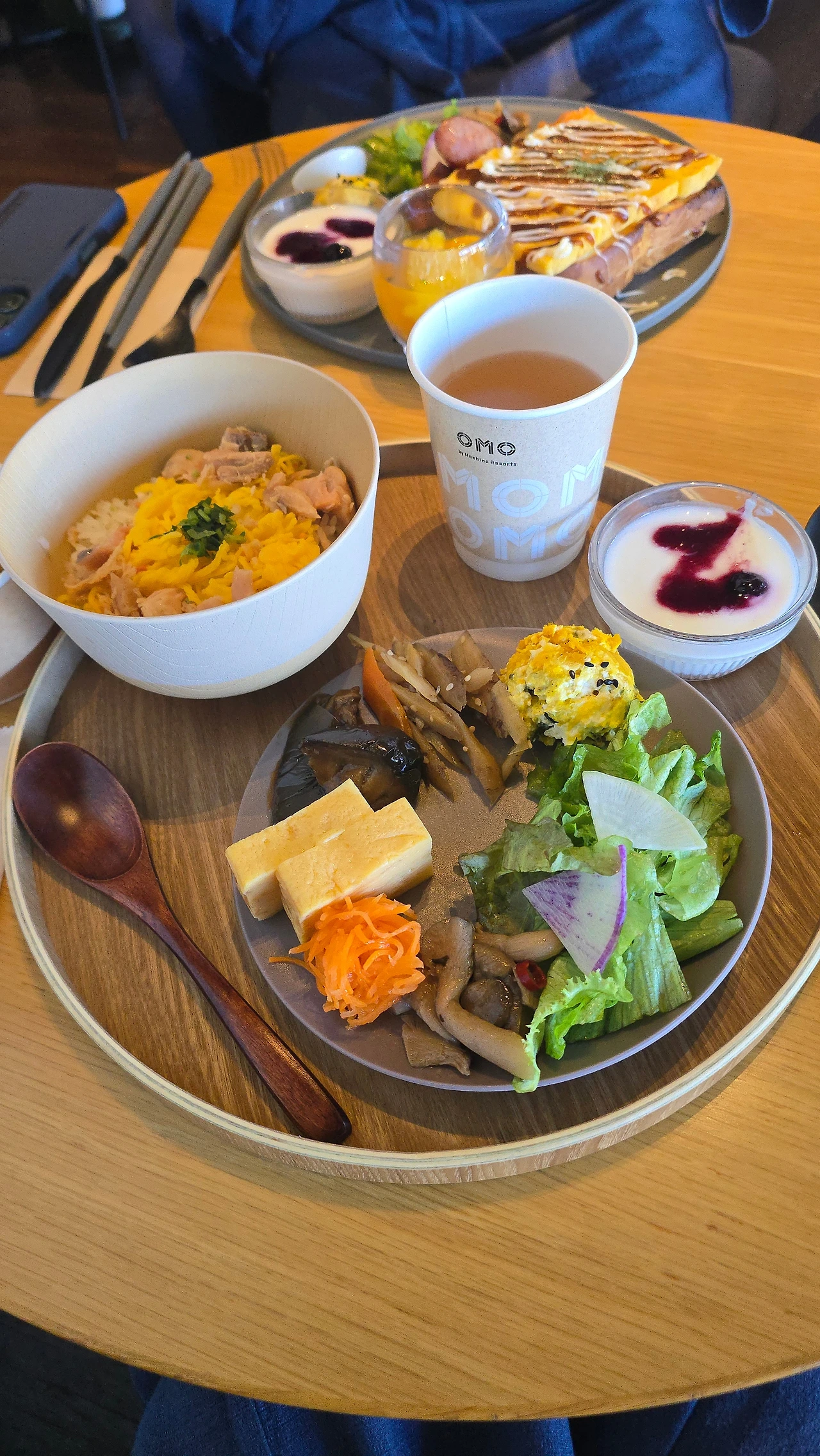 다시 유카타로 갈아입고 일본식 화장(흰 얼굴 빨간 입술?ㅎ)을 하고 조식 카페로 등장 옆에 omo dining 은 인당 4000엔 우린 체크인 때 받은 카페조식쿠폰을 이용(현장구매 1800엔) 프렌치토스트 세트와 연어밥오차세트로 든든한 아침식사 커피는 무한리필이니 앉아서 글쓰기 좋은 기회!
