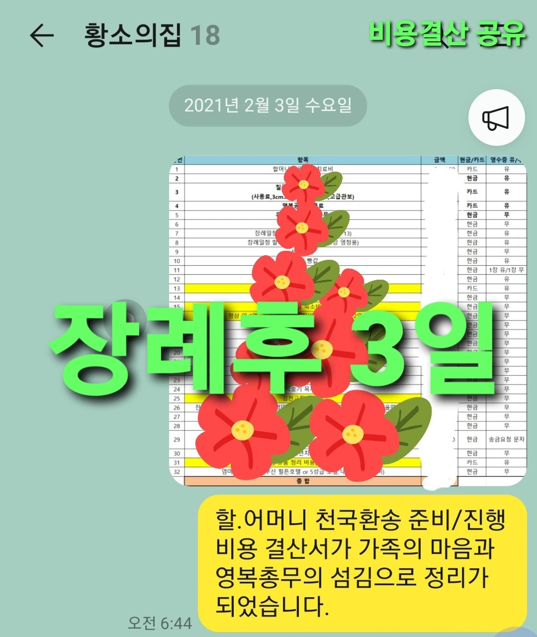 코로나-19 예방 생활속 거리두는 저녁 찾아오셔서 조문 해준 이웃, 가족들의 친구들에게 감사를 전하고 싶다는 내용을 제안했다.(상세내용은 아래 참조)