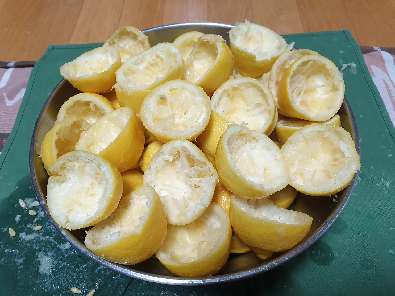 레몬 1박스를 즙으로 짜서 유리병에 담다.