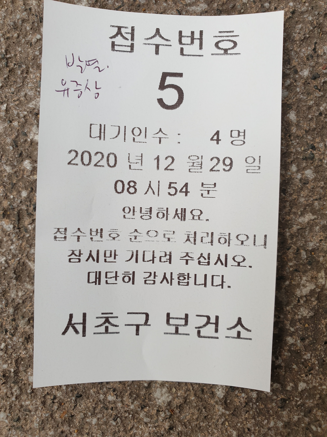 2020.12.29 새벽 서울 서초구청 보건소 주차장에서 대기하다 접수한 코로나19 검사 검체