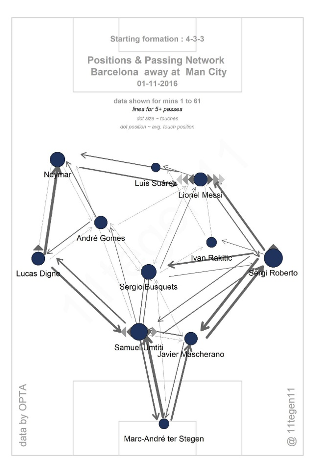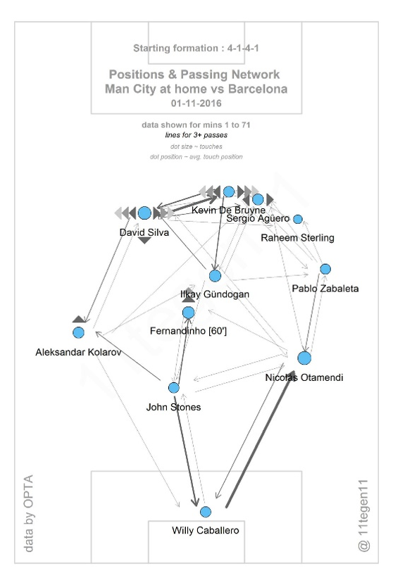 바르셀로나는 공을 많이 가지고 있었습니다. 하지만 공은 주로 중앙에 머물렀고, 맨체스터 시티 쪽으로 가는 경우나 바르셀로나 쪽으로 가는 경우나 비슷비슷했습니다. 바르셀로나가 시티 쪽으로 볼을 보내지 못했다는 것을 대략적으로 유추할 수 있는 부분입니다. 왜 이런 결과가 나왔을까요?