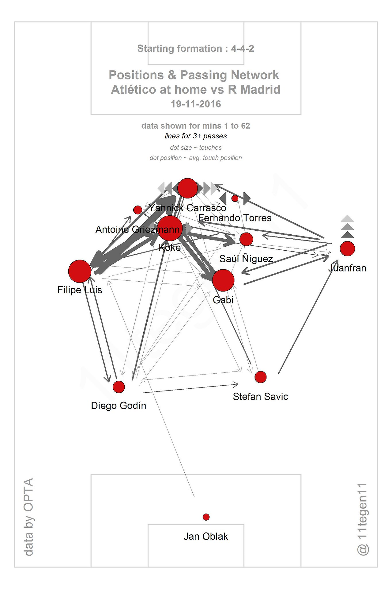다만 이렇게 하면서 AT마드리드에 문제가 하나 생겼습니다. 고딘과 사비치의 위치가 애매해진 겁니다. 두 선수는 파워가 좋지만, 스피드가 느립니다. 두 선수가 이렇게 낮은 위치에 머물러 있었던 것은 시메오네 감독이 뒷공간에 대한 문제를 인식하고 방지하기 위함이 아닐까 싶었습니다. 위에 있는 선수들이 대열을 잘 지켜내면 공은 오지 않는다는 확신을 가지고 있던 것으로 추측합니다.