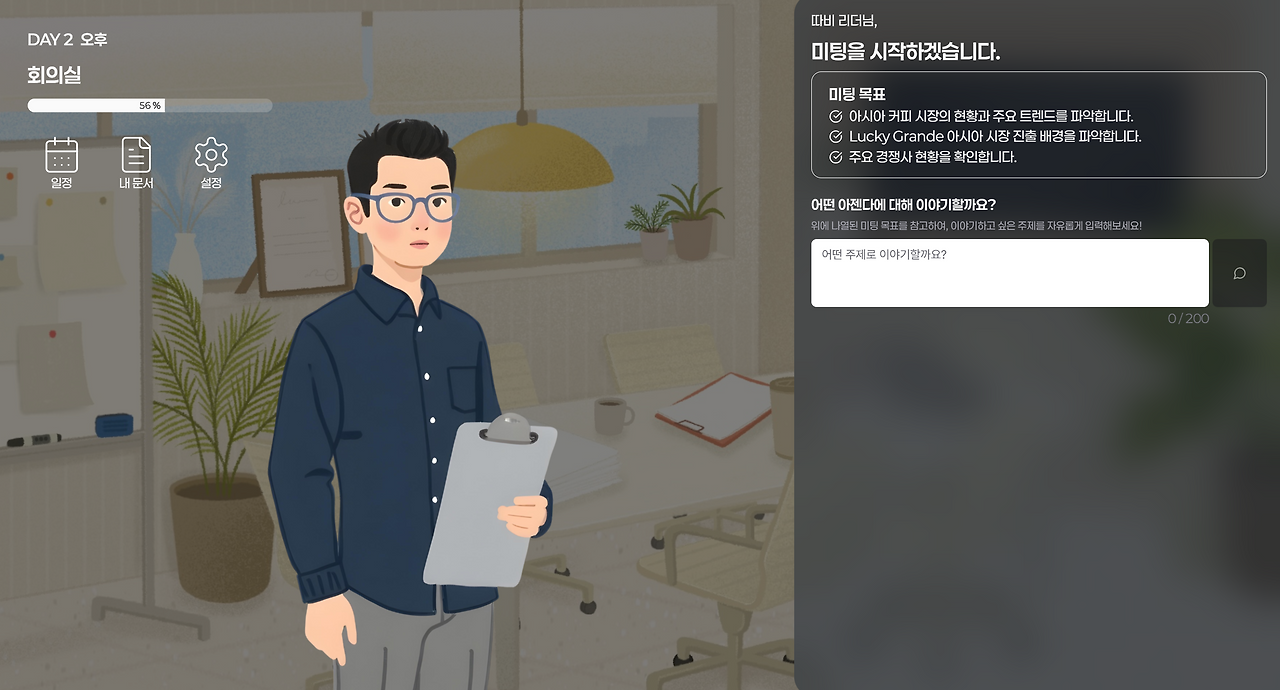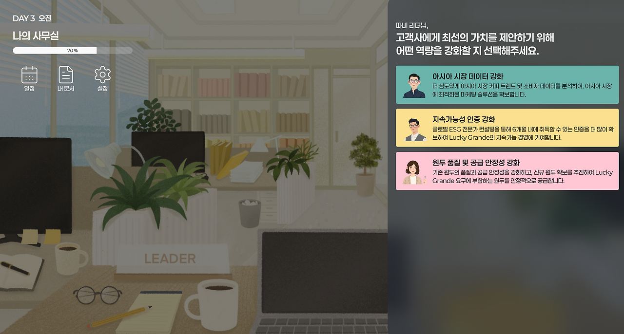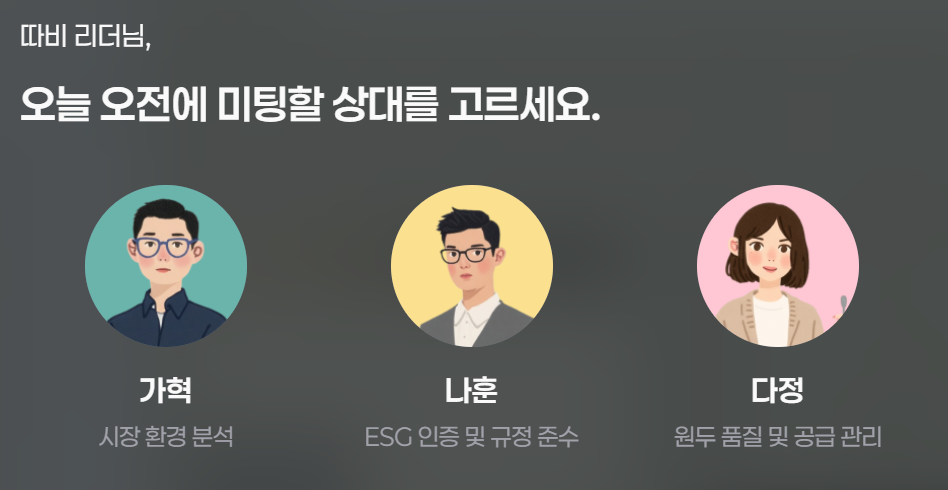 고객사의 주 요청 사항은 ‘원두 품질 및 공급’, ‘지속 가능성 인증 평가’, ‘아시아 시장 브랜딩 전략’입니다. 성공적인 제안을 위해선 이렇게 각기 다른 3가지 전문성을 두루 이해해야 하겠죠? 하지만 우리의 고객은 시간을 충분히 주지 않습니다. 이에 플레이어는 선택과 집중을 통해 Day 1에 미팅을 진행할 2명을 선택해야 합니다.