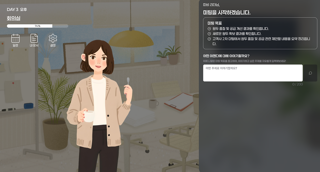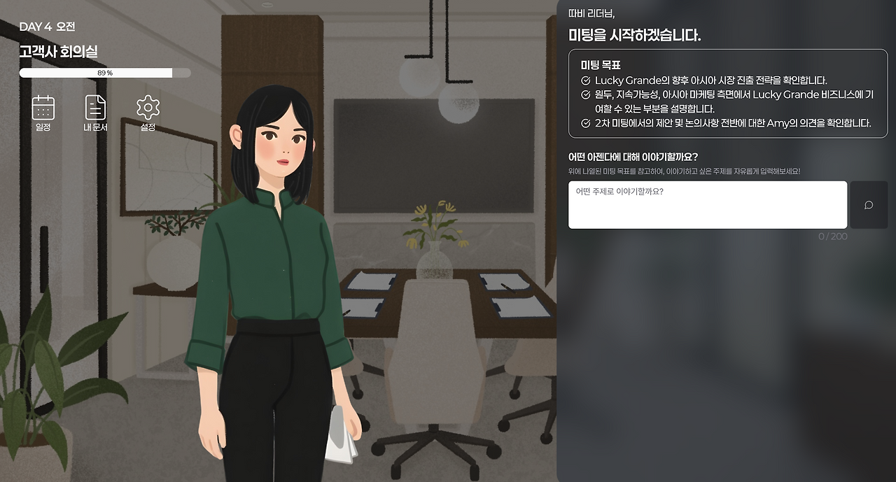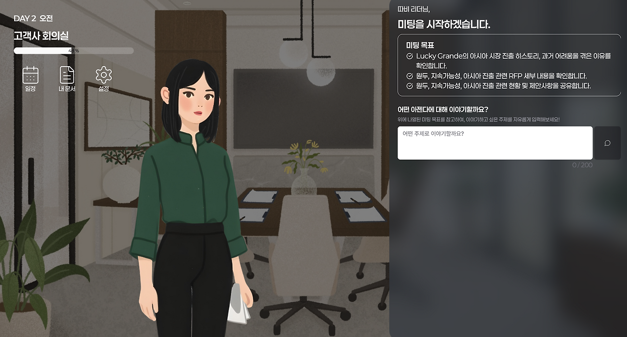 생성형 AI 기반 게임은 결과를 예측할 수 없는 실감 나는 대화 경험을 주지만, 때로는 학습자가 어떤 말을 해야 할지 방향성을 잃곤 합니다. 미팅의 목표는 게임에 친숙하지 않은 참가자에게 방향성을 제시하는 역할을 합니다.