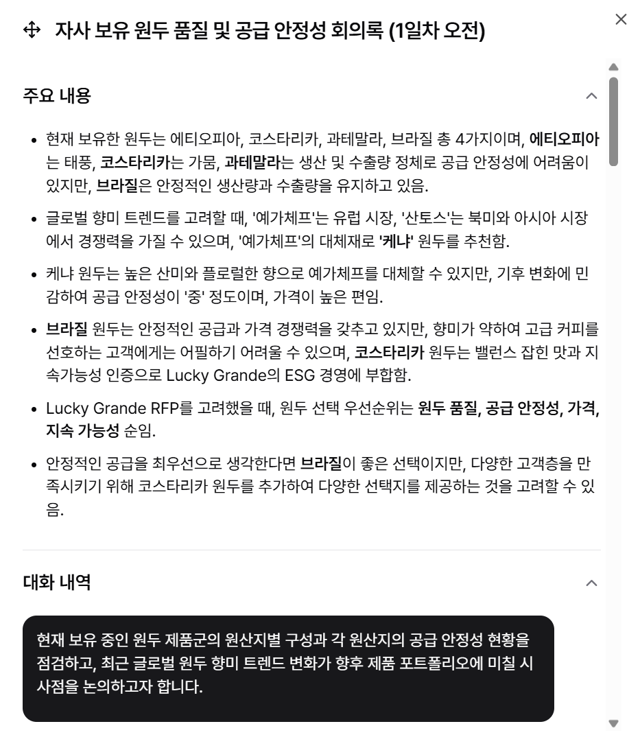 미팅 이후에는 AI가 대화 내역을 요약하여 주요 내용을 회의록으로 정리하여 추후에도 참고 자료로 활용할 수 있도록 합니다.