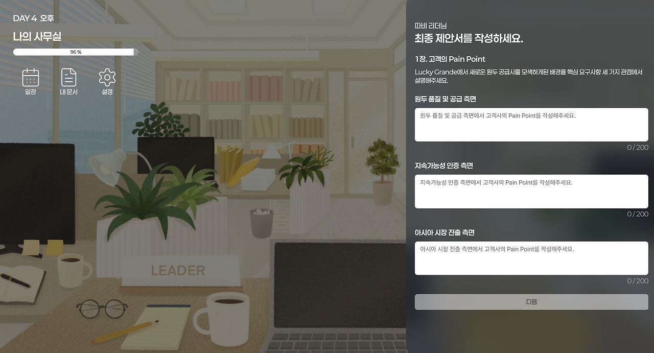 현재까지 진행된 모든 미팅을 기반으로 최종 제안서를 작성합니다. 고객의 Pain Point, 원두 공급 제안, 지속가능성 인증 제안, 아시아 시장 진출 제안의 4가지 영역에서 가이드에 따라 최종 제안서를 작성합니다. 이 제안서는 RFP의 요청 내용을 기반으로 객관식, 주관식 문항으로 구성되어 있고 게임에 성실히 참여하였다면 쉽게 작성할 수 있습니다.