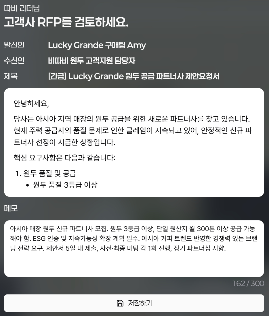 AI가 대화 내역을 분석하여 이러한 목표들을 모두 달성했는지 여부를 파악합니다. 물론, 목표는 미팅을 성사시키기 위한 최소한의 목표일 뿐, 좋은 제안서와 솔루션을 도출하기 위해서 더 깊은 대화를 통해 숨은 이야기들을 끄집어낼 수 있습니다.