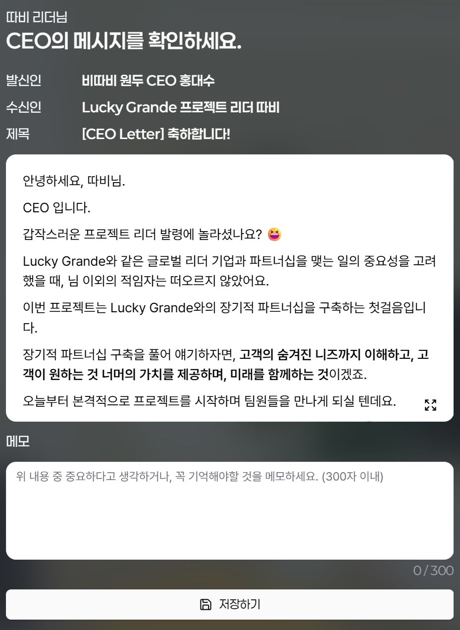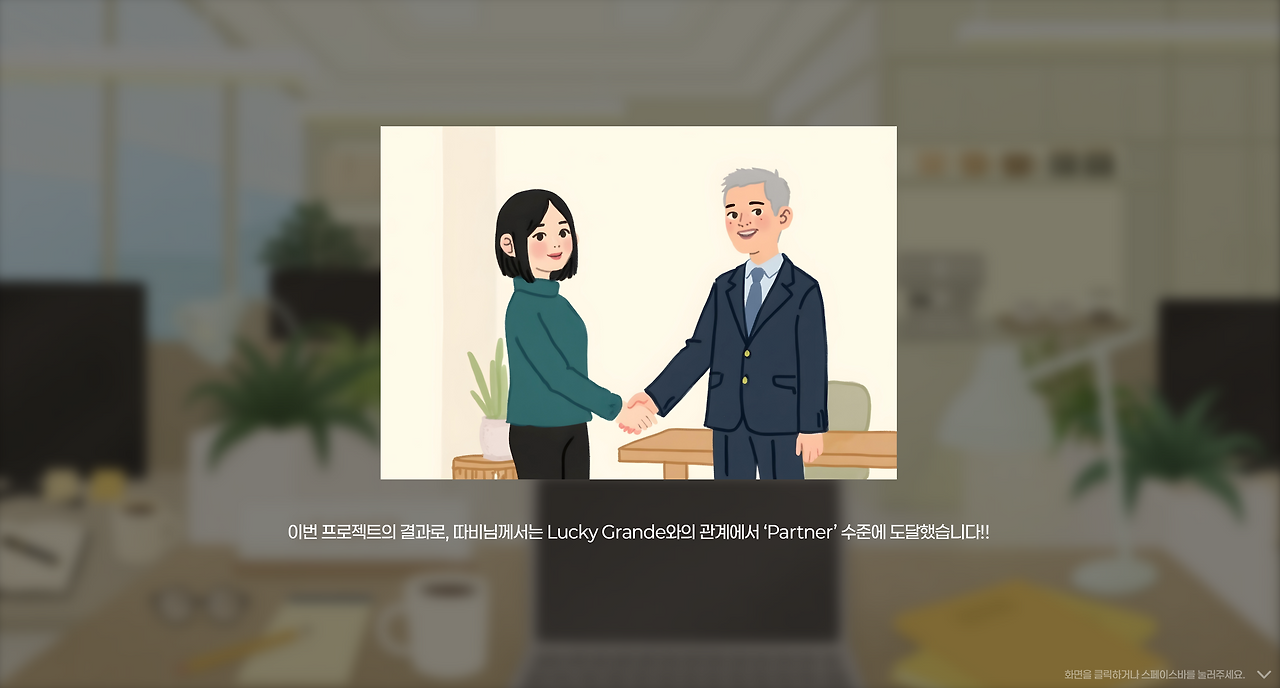 MVP Partners는 이러한 복잡한 B2B 상황을 생성형 AI를 통해 안전한 시뮬레이션 환경으로 구현하여, 고객 중심 사고를 ‘이해하는 것’에서 ‘실천하는 것’으로 전환할 수 있도록 설계된 게임학습콘텐츠입니다.