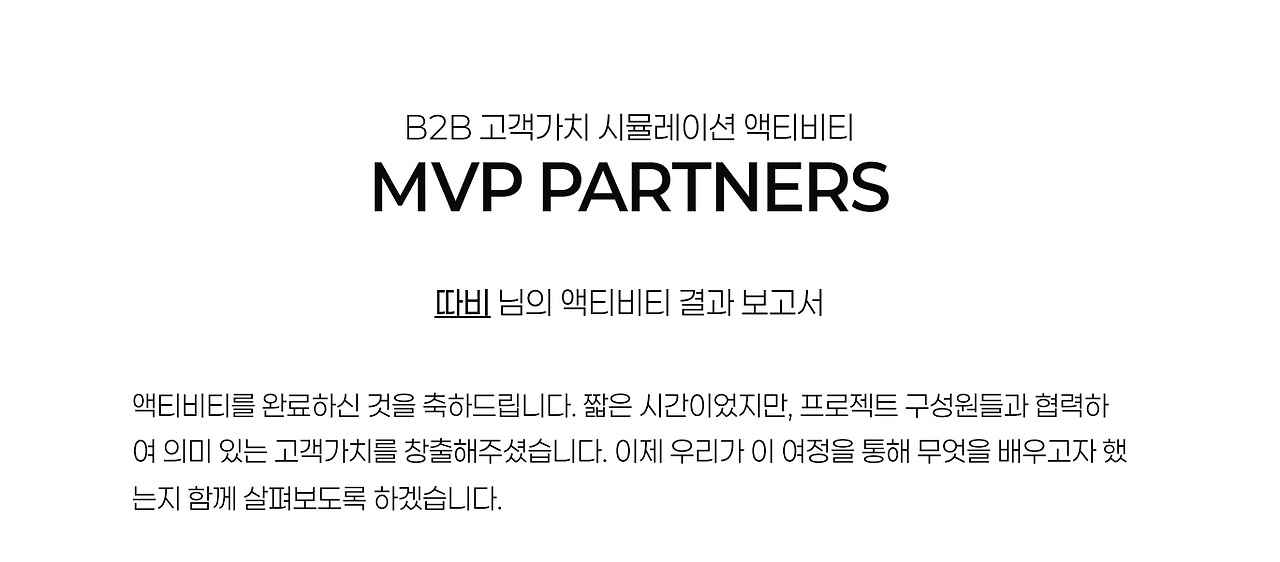 결국 MVP Partners를 통해 학습자는 복잡한 B2B 비즈니스 상황 속에서도 고객을 기준으로 생각하고, 선택하며, 그 이유를 설명할 수 있는 사고방식을 체득하게 됩니다. 이는 고객 중심 사고를 실제 업무 상황에서도 활용 가능한 실천적 역량으로 전환시키는 경험이라 할 수 있습니다.