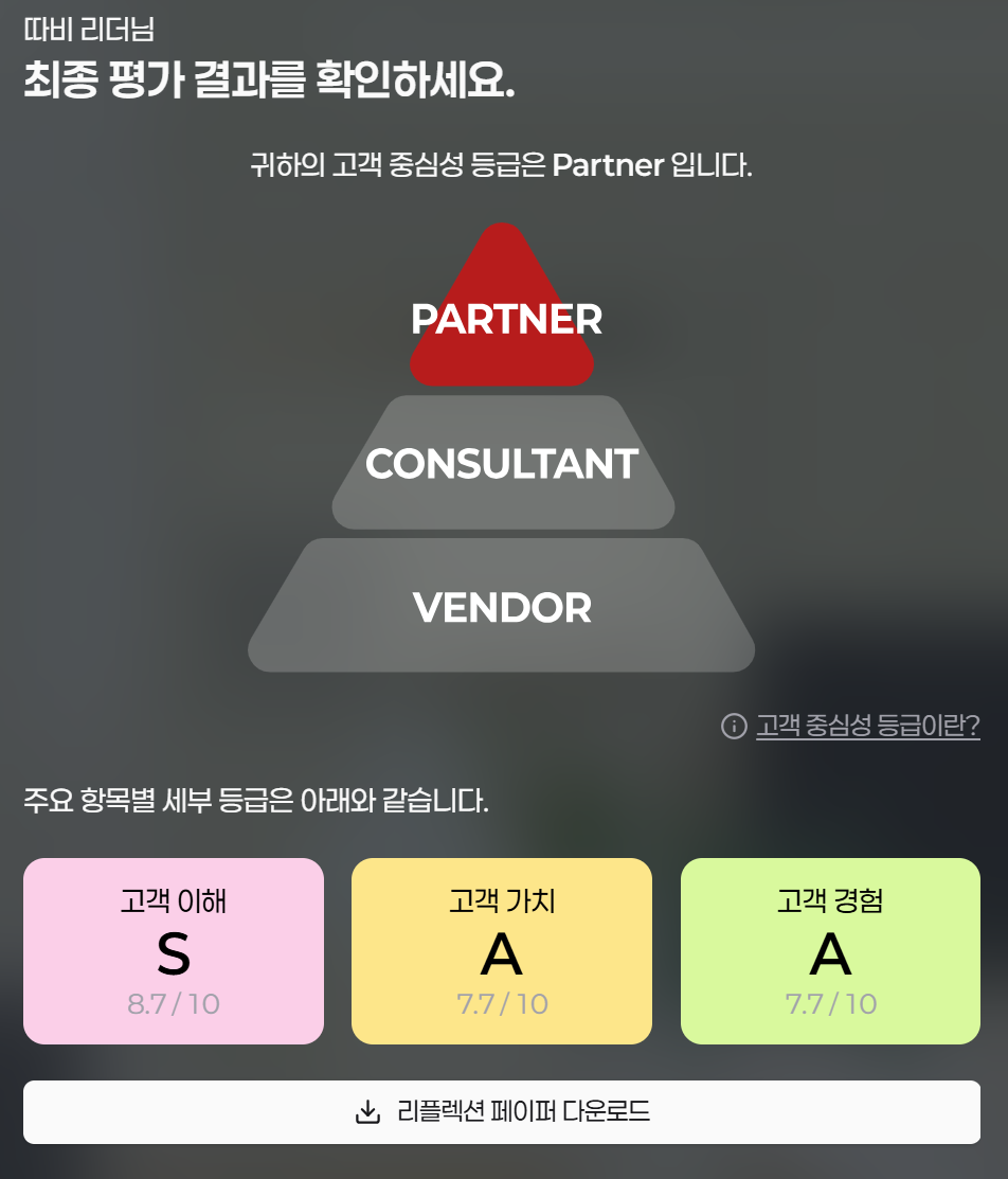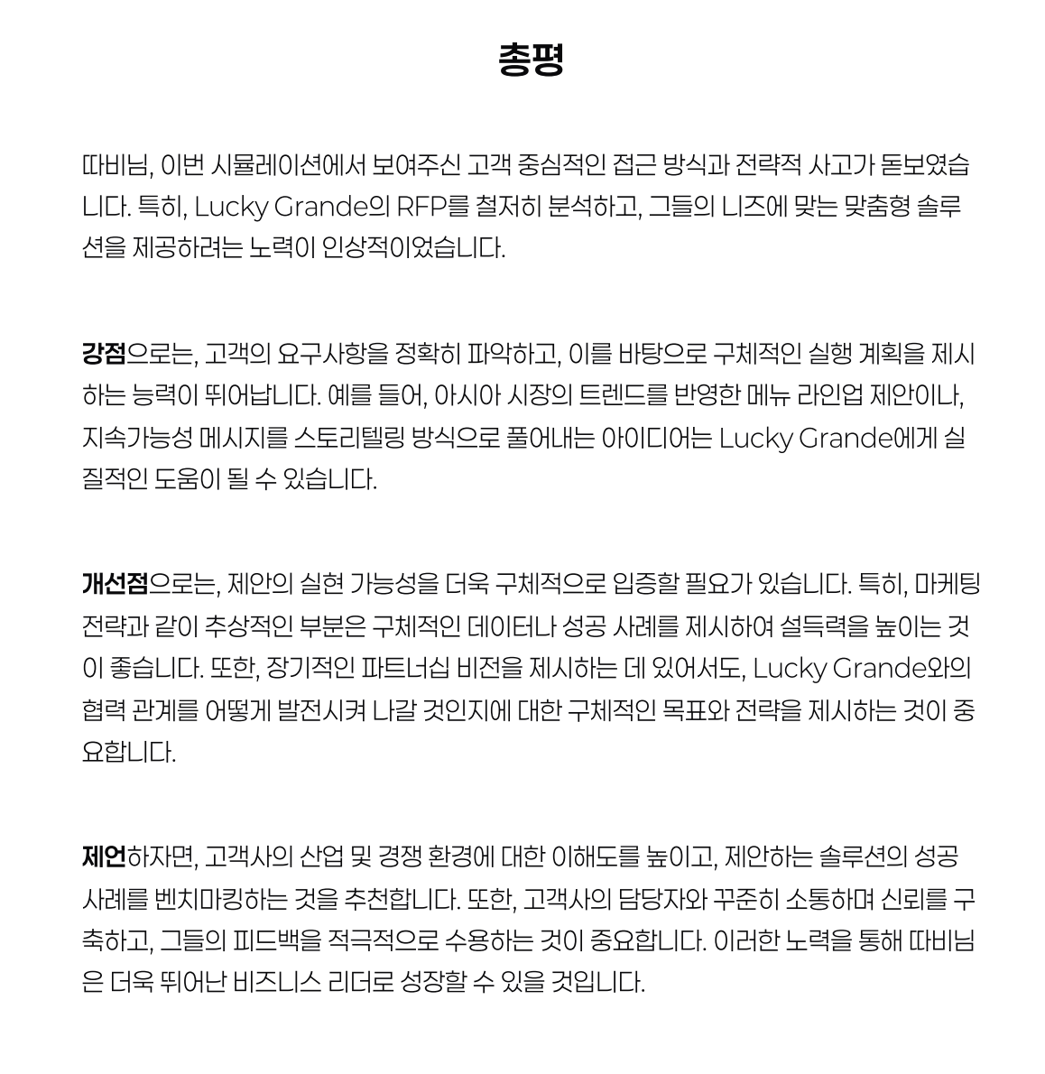 액티비티 이후에는 리플렉션 페이퍼를 통해 고객 이해, 고객 가치, 고객 경험의 면에서 잘한 점과 개선이 필요한 부분, 총평 등을 제공함으로써 학습자가 고객 중심 사고성 역량을 얼마나 보유하고 있는지 성찰할 수 있게 합니다.
