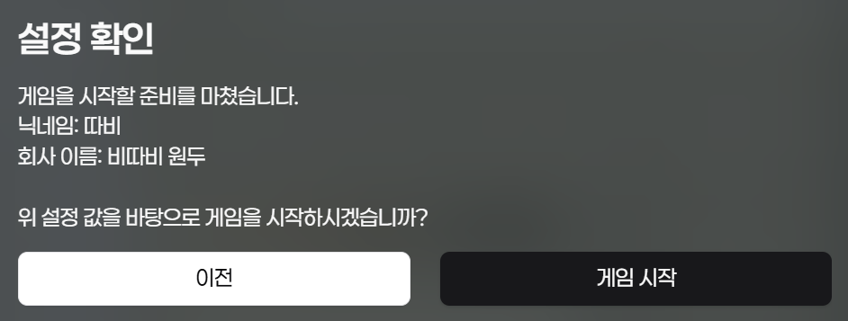 닉네임과 회사 이름을 정하면, 게임이 시작됩니다.