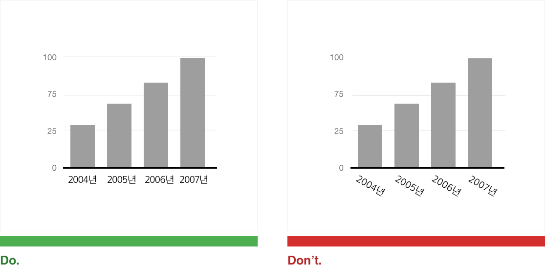 글자가 옆으로 기울어져 있으면 가독성이 떨어지기 때문에 가로(항목)축 글자는 수평하게 표시해야한다.