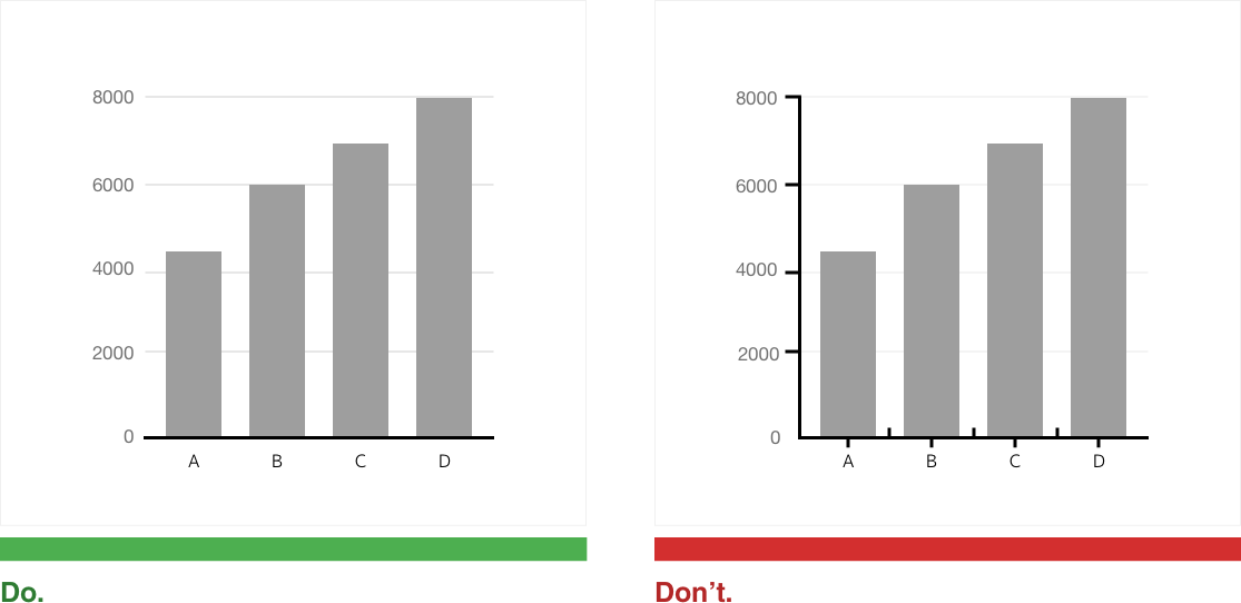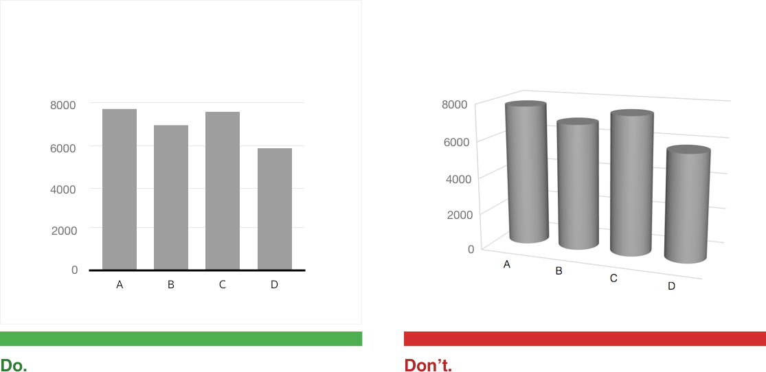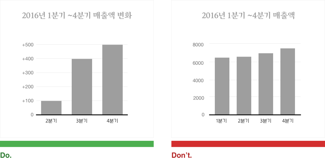 세로(값)축의 최소값은 언제나 0이어야한다. 값이 변경되면 막대들 간의 관계가 왜곡된다.