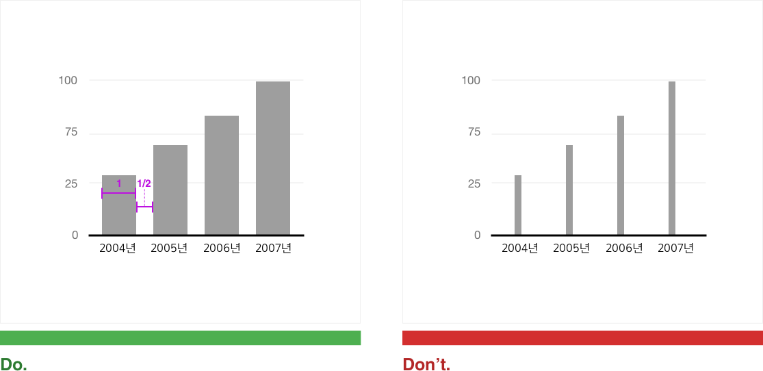 막대 사이의 공간이 막대의 폭보다 넓으면 시선이 여백에 집중된다. 여백에는 아무런 데이터가 없지 않는가?