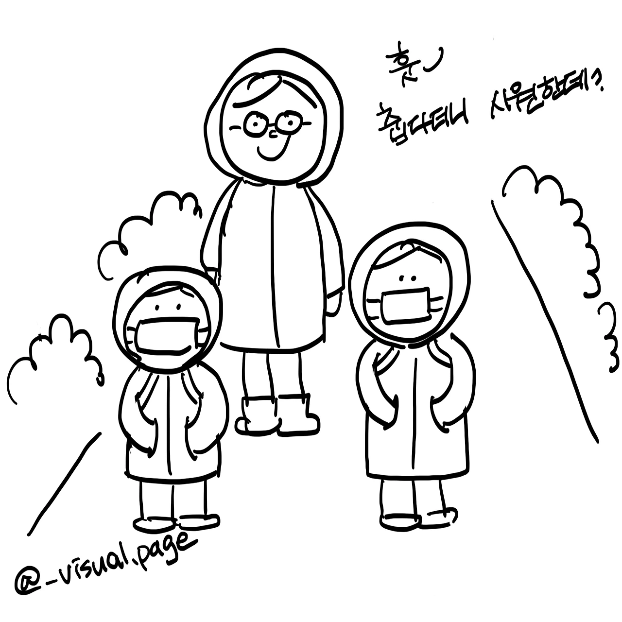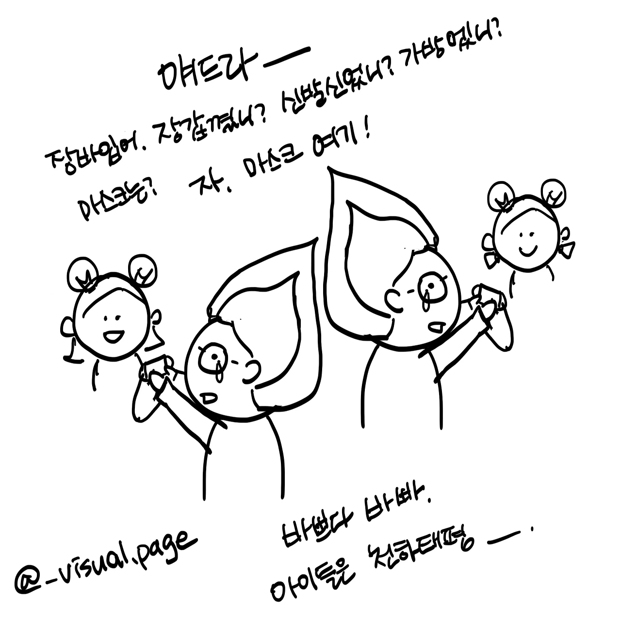 아이들 등원 길, 애 둘 잠바 입히고 가방 챙기고 마스크 씌워주느라 바빠서 내 마스크는 빼먹고 나왔다. 시계와 엘리베이터 층수 화면을 번갈아 보느라 눈이 예리한 첫째 마저도 내가 마스크를 안 한 것을 몰랐다. 현관에서 나와 아이들 두 손 잡고 걷는 순간 시원한 공기가 입 속을 한 바퀴 돌아 목구멍으로 넘어갔다. 아뿔싸, 노 마스크다. “얘들아~ 엄마 마스크 안 하고 나왔어. 어쩌지?” 하지만 그대로 유치원 버스를 타러 가야 하나 집으로 다시 가야 하나 고민도 사치일 만큼 1분 1초가 바빴기에 옷으로 입과 코를 틀어막고 버스로 향해 달렸다.