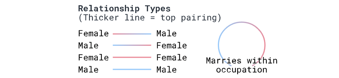 블룸버그 뉴스는 결혼과 직업 간에 어떠한 연관성이 있는지 의문을 가졌다. 미국 인구조사국(U.S. Census Bureau)에서 350만 가구를 대상으로 한 설문(2014 American Community Survey) 데이터를 바탕으로, 어떤 직업들간에 결혼이 이루어지는지 데이터 시각화를 통해 알아보았다. 다음은 시각화를 만들어낸 규칙이다.